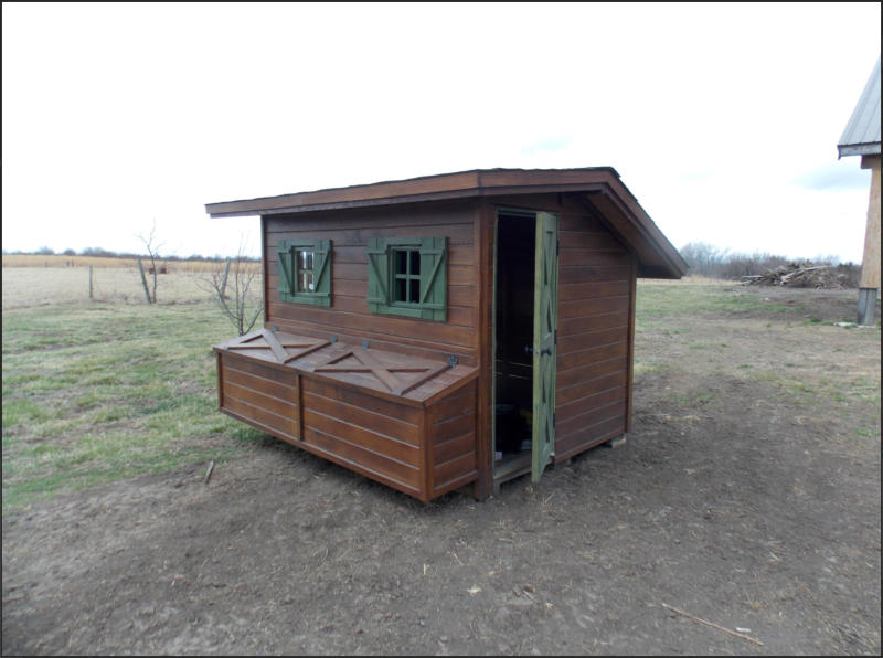 This kit is 6’ x 8’ and has additional nesting boxes. The boxes have outside access for easy