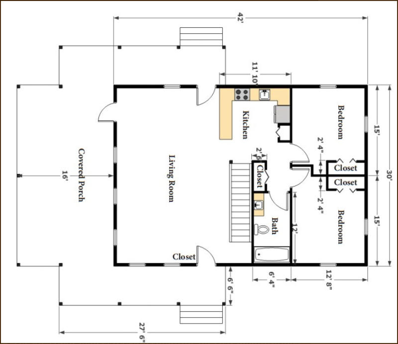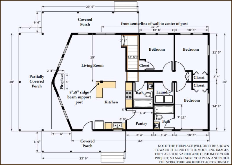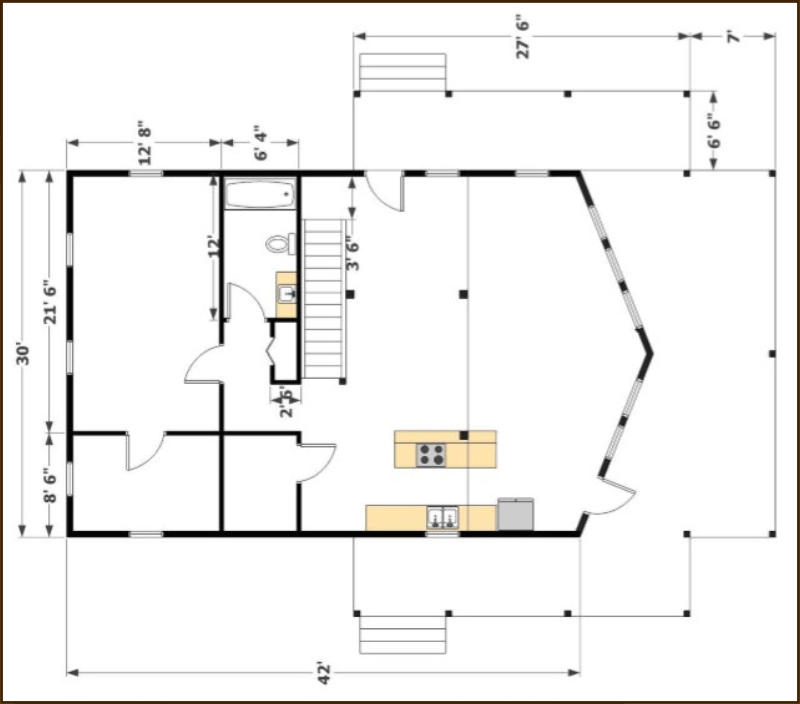The 2000 sq ft Chalet Oak log cabin kit is designed to offer a spacious yet cozy log home experience. The cabin has a 42' x 30' footprint and features a covered porch, providing ample outdoor space for relaxation. This model emphasizes natural light and an airy atmosphere with numerous windows. The interior maintains a rustic charm with exposed oak timbers and log walls.The kit's floor plan is versatile, allowing for easy modifications to add or enlarge rooms according to your needs. It includes vaulted shiplap ceilings with exposed timber rafters, enhancing the cabin's warm and rustic aesthetic. The cabin can be built on a slab foundation, basement, or crawl space, accommodating various site conditions.